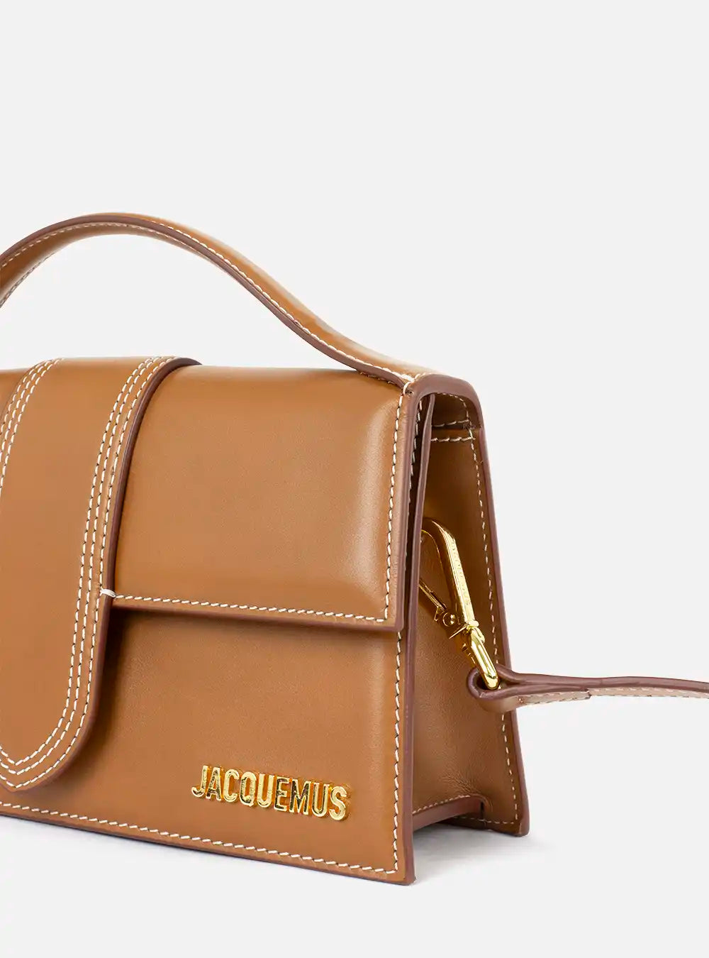 Le Grand Bambino in pelle di vitello castano con logo dorato in rilievo. Battente con chiusura magnetica, manico piatto e tracolla rimovibile. Interno con tasca a soffietto.