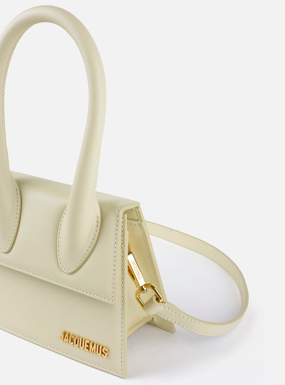 Il Chiquito Money in pelle di vitello beige chiaro con logo dorato in rilievo. Battente con chiusura magnetica, manico rigido ad arco e tracolla rimovibile. Interno compatto con tasca a soffietto.