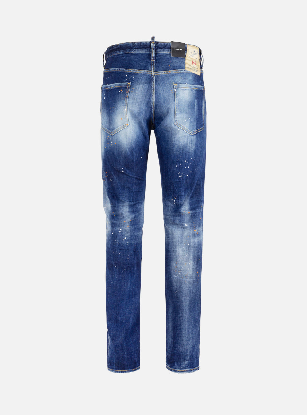 Jeans cool guy in denim blu con effetto schiarito. Modello cinque tasche, effetto sbiadito di pittura, chiusura con bottone e toppe ricamate sulla superficie frontale.