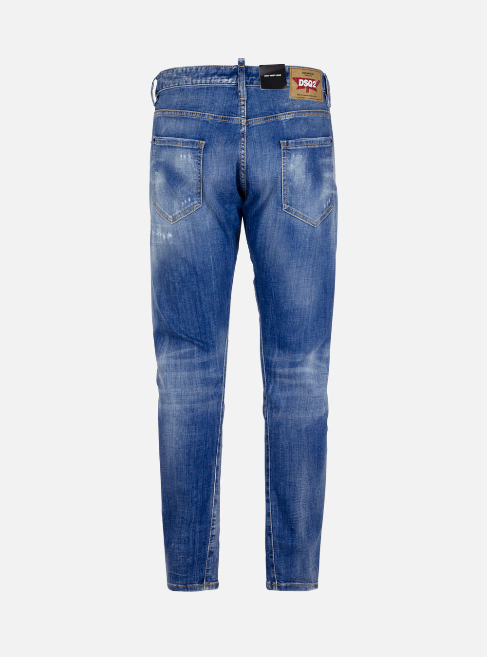 Jeans in denim blu con design sexy twist ed effetto vissuto. Modello cinque tasche, texture strappata, chiusura con bottone, patch logo sul retro e etichetta logata frontale.