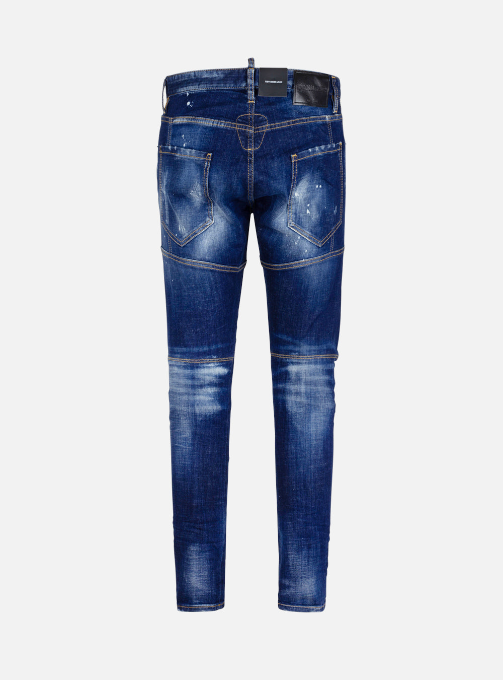 Jeans Tidy Biker in denim blu con effetto schiarito. Modello cinque tasche, classica texture semi-consumata, chiusura con bottone, logo del brand con effetto splattern sulla tibia e etichetta logata frontale in giallo.