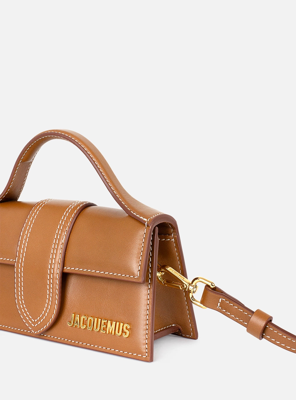 Le Bambino in pelle di vitello marrone con logo dorato in rilievo. Battente con chiusura magnetica, manico rigido ad arco e tracolla rimovibile. Interno con tasca a soffietto.