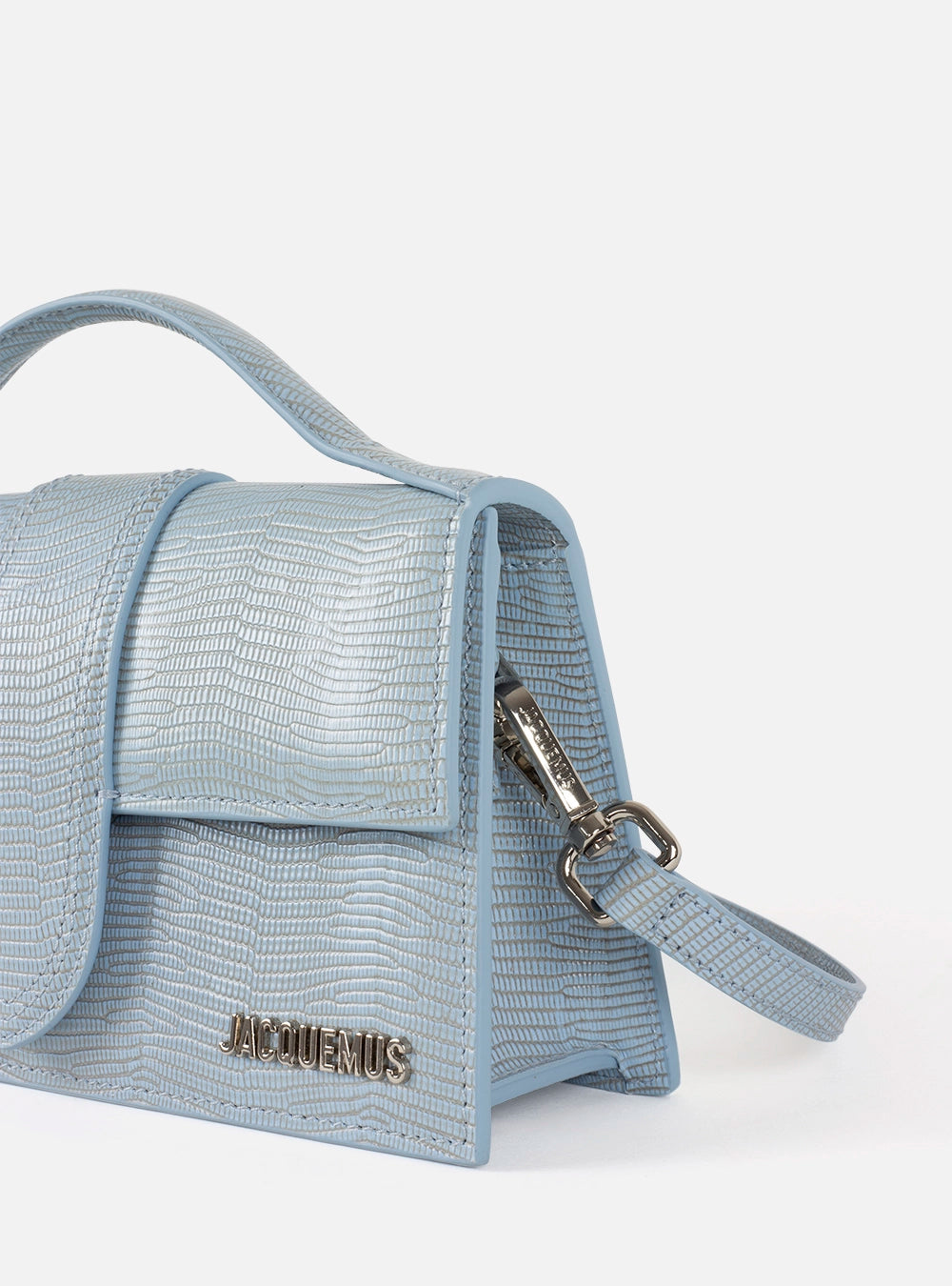 Le Grand Bambino Croisièr in pelle azzurra effetto rettile con logo argento in rilievo. Battente con chiusura magnetica, manico piatto e tracolla rimovibile. Interno con tasca a soffietto.