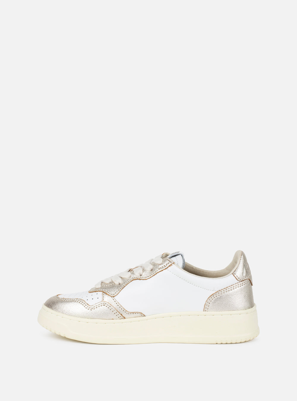 Sneakers medalist low in pelle bianca e dettagli metallizzati platino. Tomaia in pelle, punta con microfori