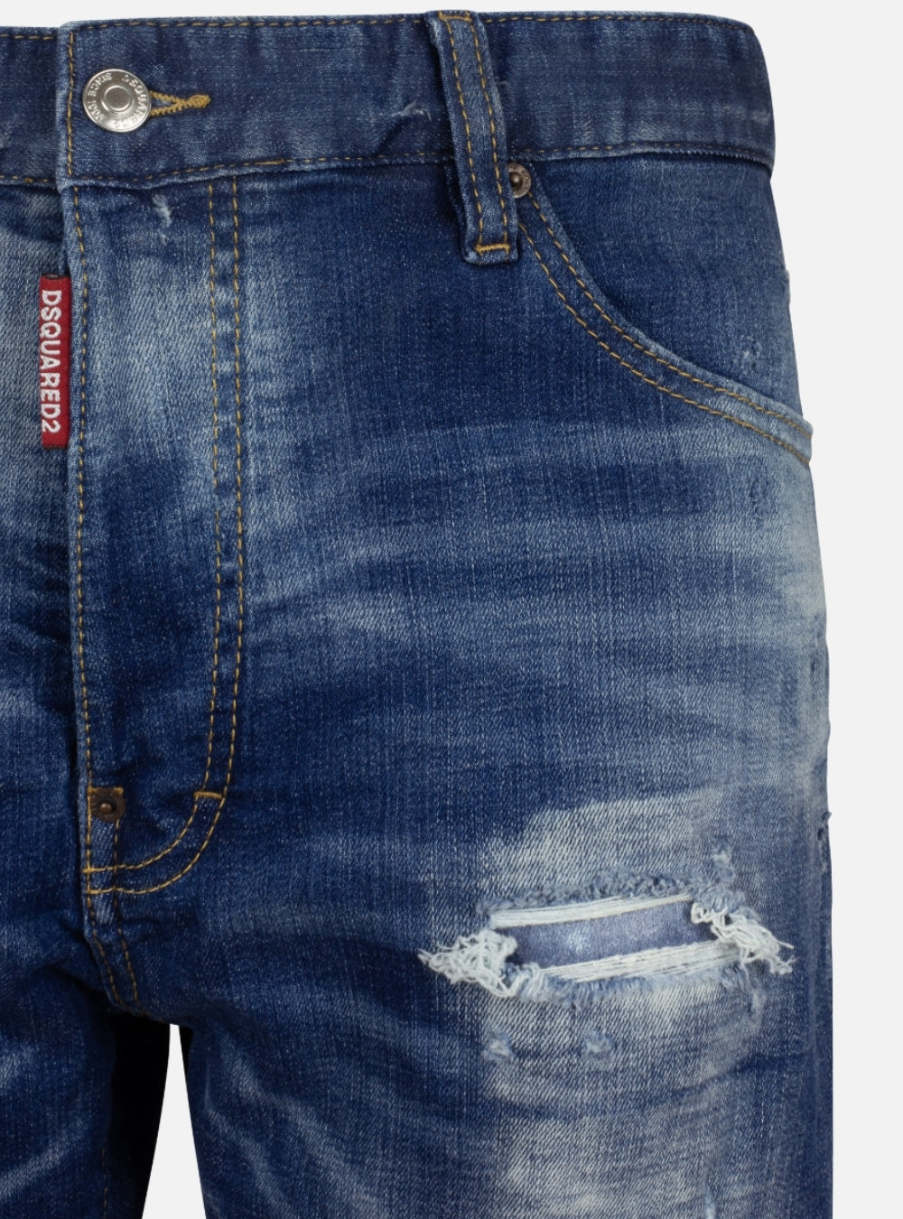 Bermuda in denim a cinque tasche con effetto vernice ed effetto vissuto con strappi. Chiusura con bottoni a scomparsa e linguetta brand cucita. Dietro troviamo la patch in pelle con dettaglio bandiera canadese.