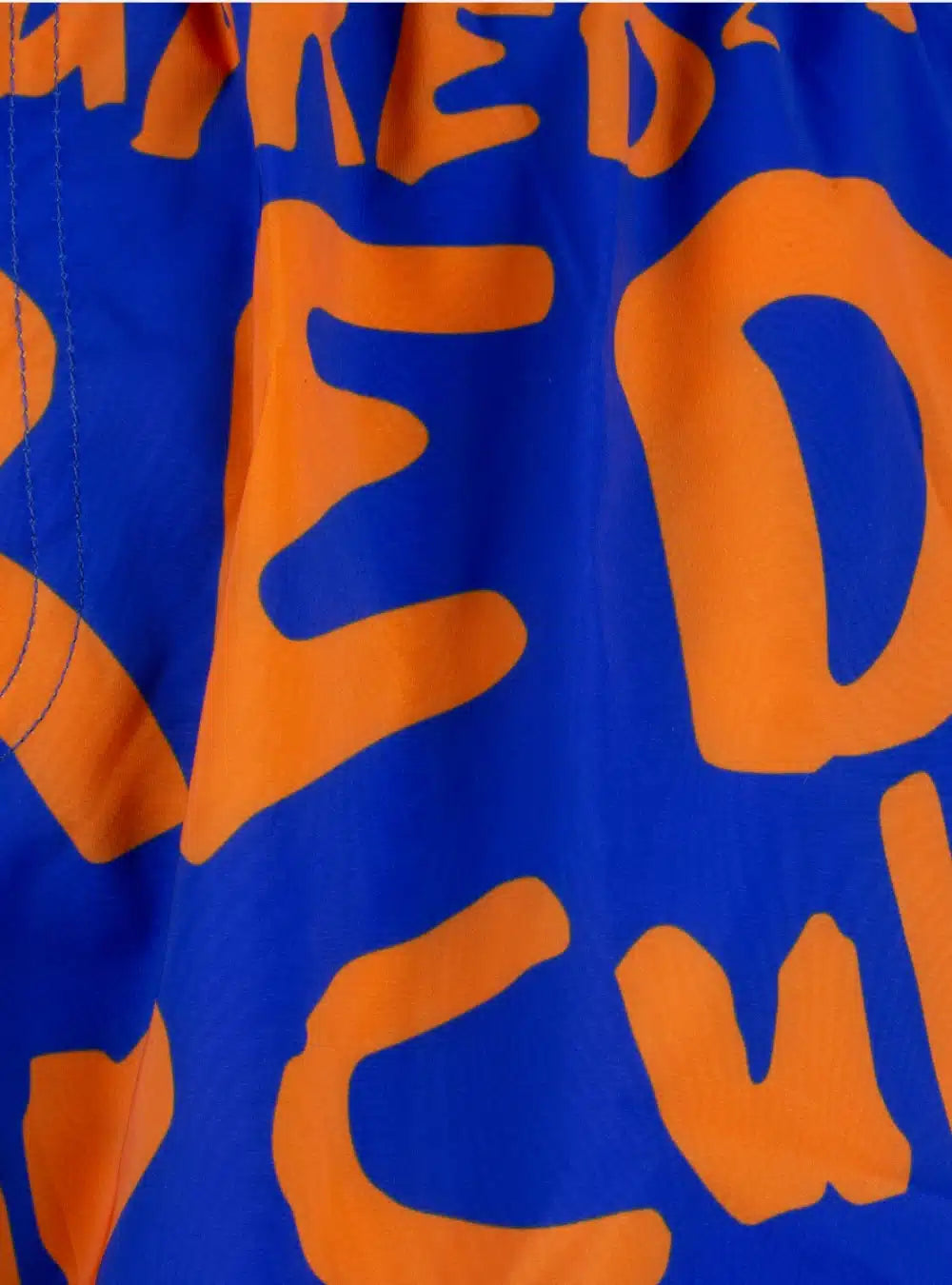 Costume da bagno viola con stampa, chiusura con coulisse e due tasche laterali a fessura.