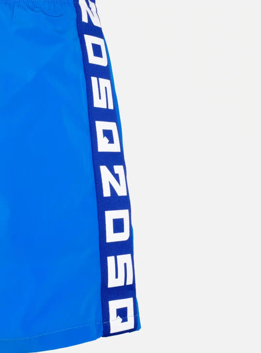 Costume da bagno celeste con banda su entrambi i lati, chiusura con coulisse e due tasche laterali a fessura.