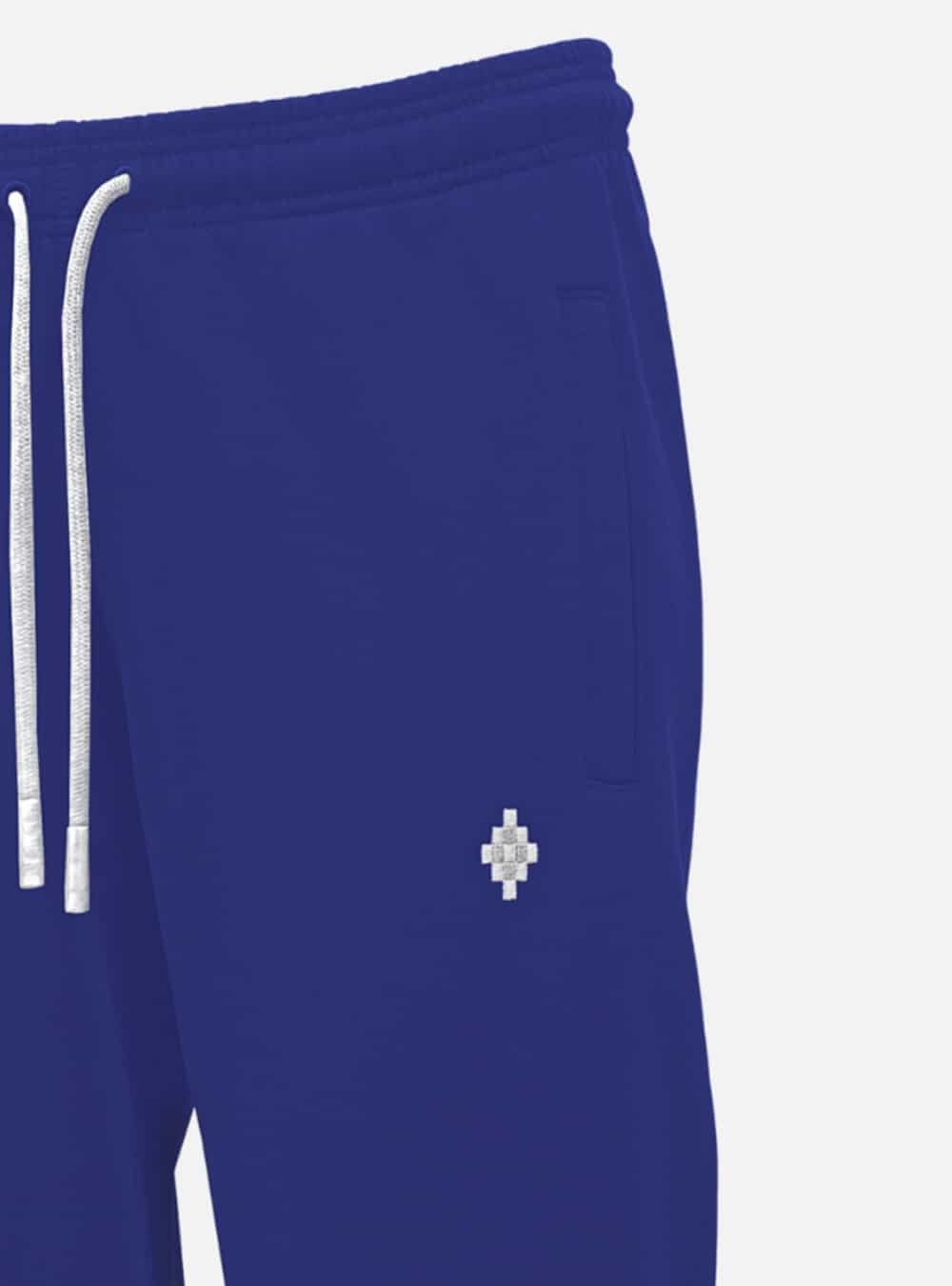 Pantalone blu con logo ricamato, orli alle caviglie e vita con fascia elasticizzati. Le tasche presentano la zip a differenza di quella posteriore a filetto.