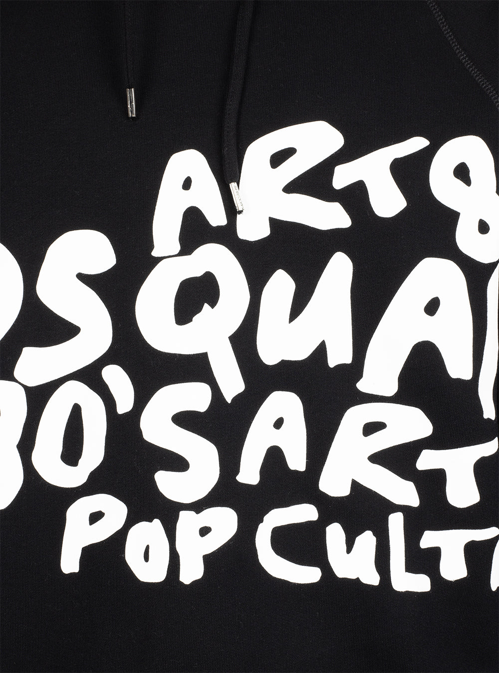 Hoodie with cuffs and drawstrings. 80s Pop graphic print that references the culture and art of that period.