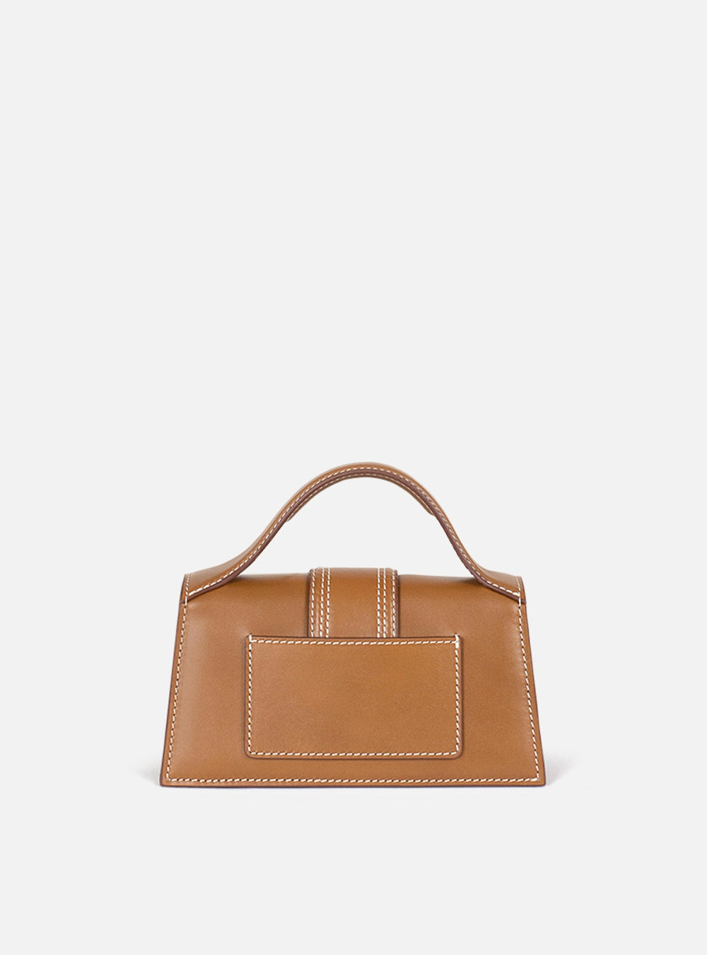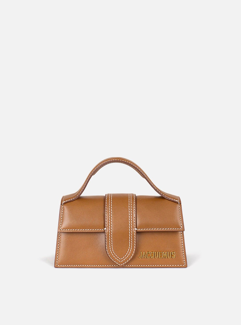 The Bambino in brown calfskin with an embossed gold logo. It features a foldover top with magnetic closure, a rigid arched handle, and a removable shoulder strap. Interior features a gusseted pocket.