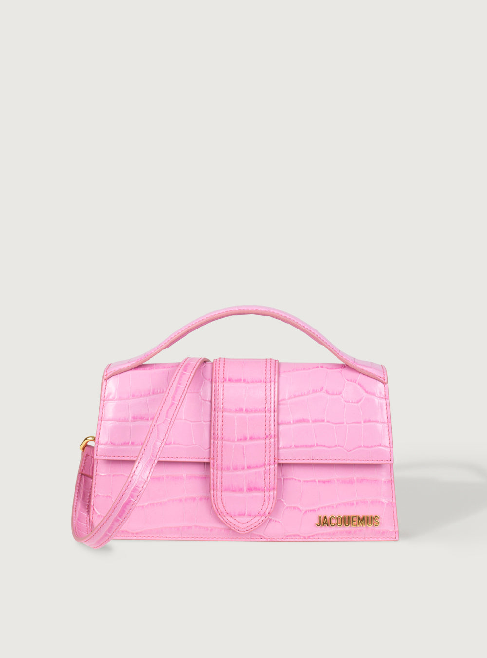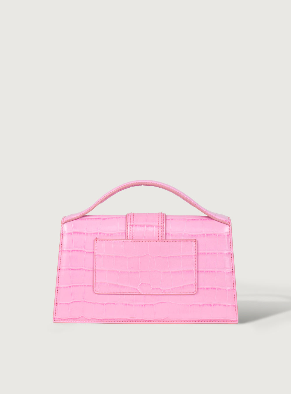 Le Grand Bambino in pastel pink leather, crocodile motif with embossed gold logo. Foldover top with magnetic closure, flat handle, and removable shoulder strap. Interior with gusseted pocket.