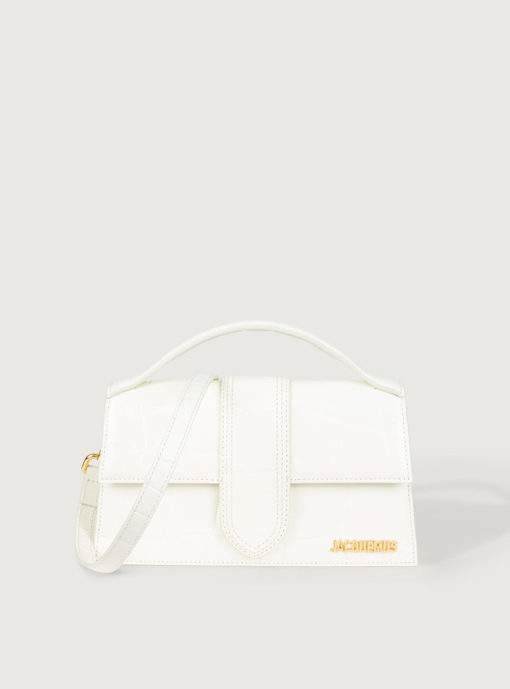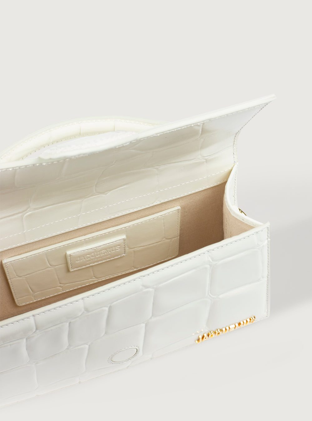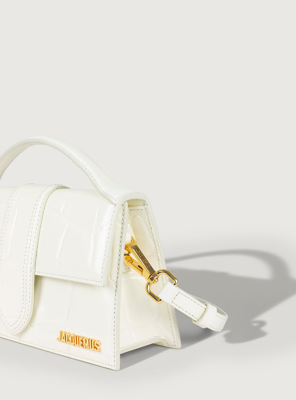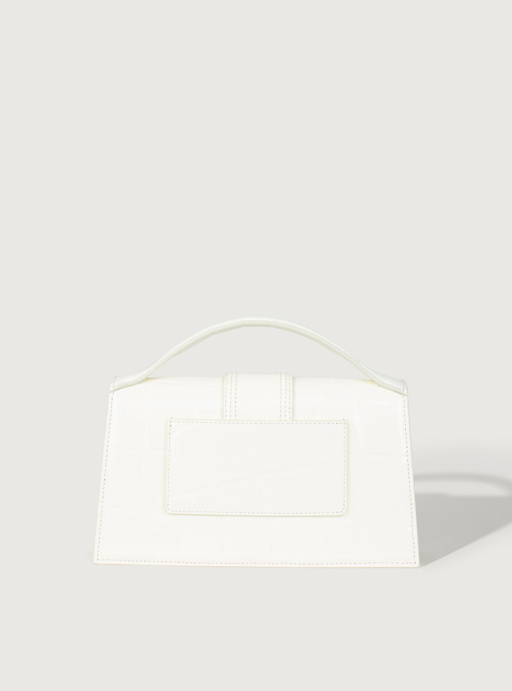 Le Grand Bambino in white leather, crocodile motif with embossed gold logo. Foldover top with magnetic closure, flat handle, and removable shoulder strap. Interior with gusseted pocket.