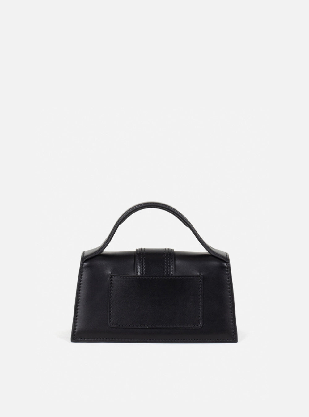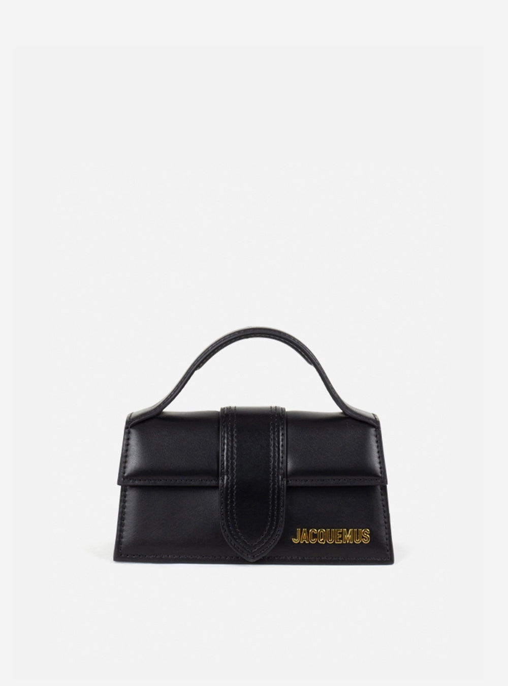 The Bambino in black calfskin with an embossed gold logo. It features a foldover top with magnetic closure, a rigid arched handle, and a removable shoulder strap. Interior features a gusseted pocket.