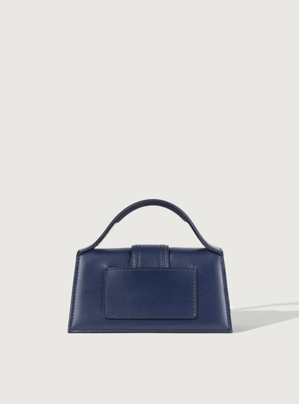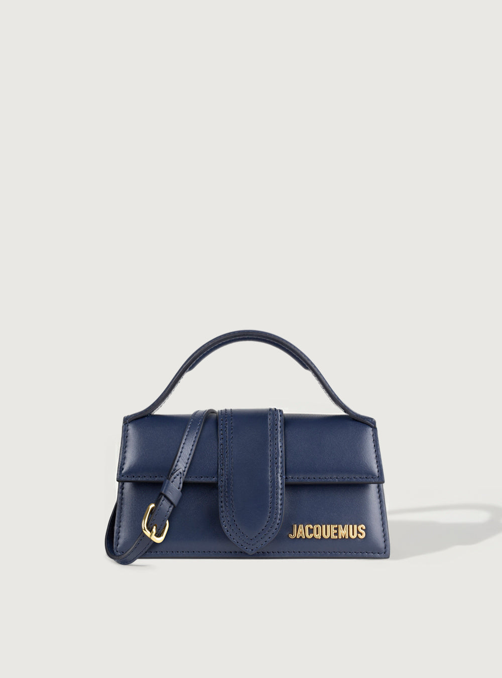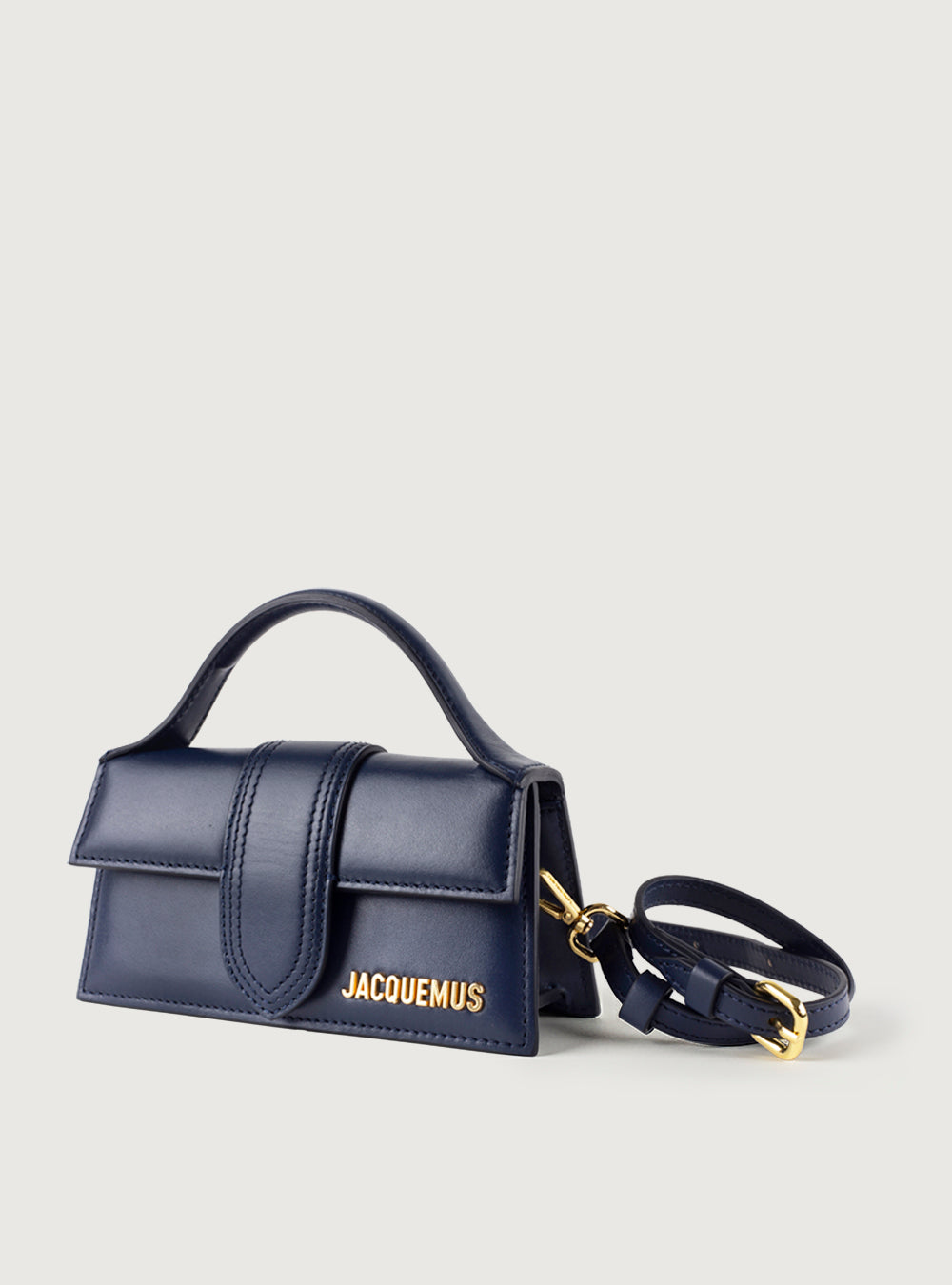 Le Bambino in pelle di vitello blu con logo dorato in rilievo. Battente con chiusura magnetica, manico rigido ad arco e tracolla rimovibile. Interno con tasca a soffietto.