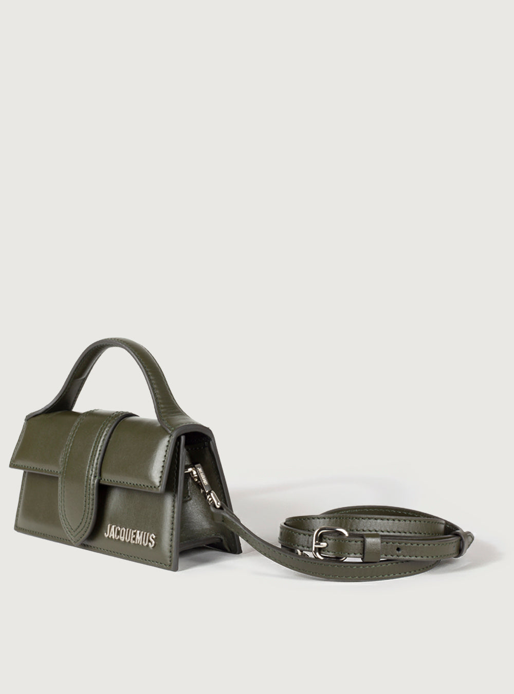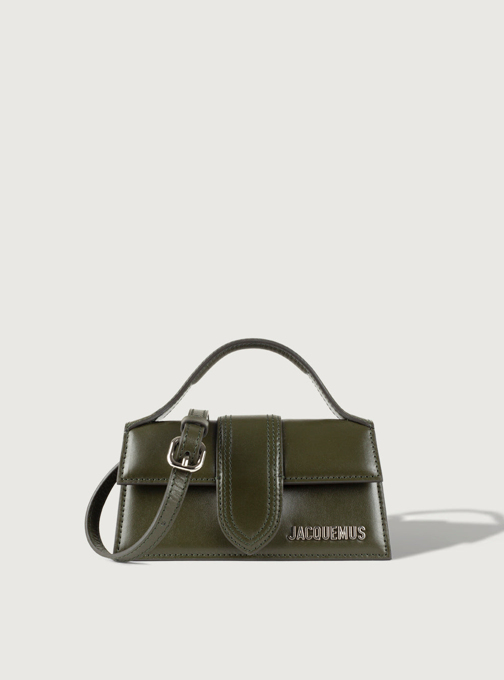 Le Bambino in pelle di vitello verde cachi scuro con logo argentato in rilievo. Battente con chiusura magnetica, manico rigido ad arco e tracolla rimovibile. Interno con tasca a soffietto.