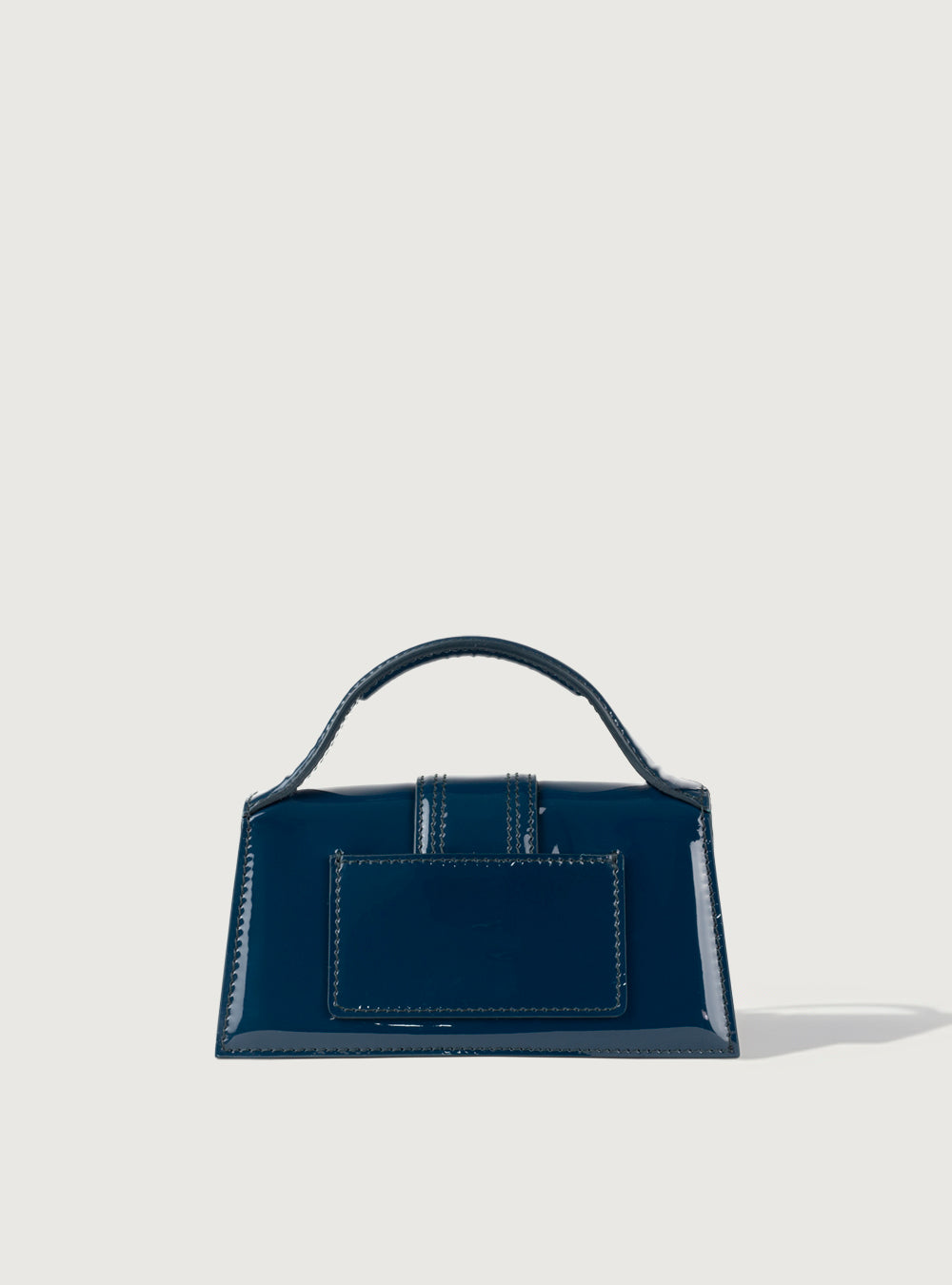 Le Bambino in pelle di vitello blu oceano lucida con logo dorato in rilievo. Battente con chiusura magnetica, manico rigido ad arco e tracolla rimovibile. Interno con tasca a soffietto.