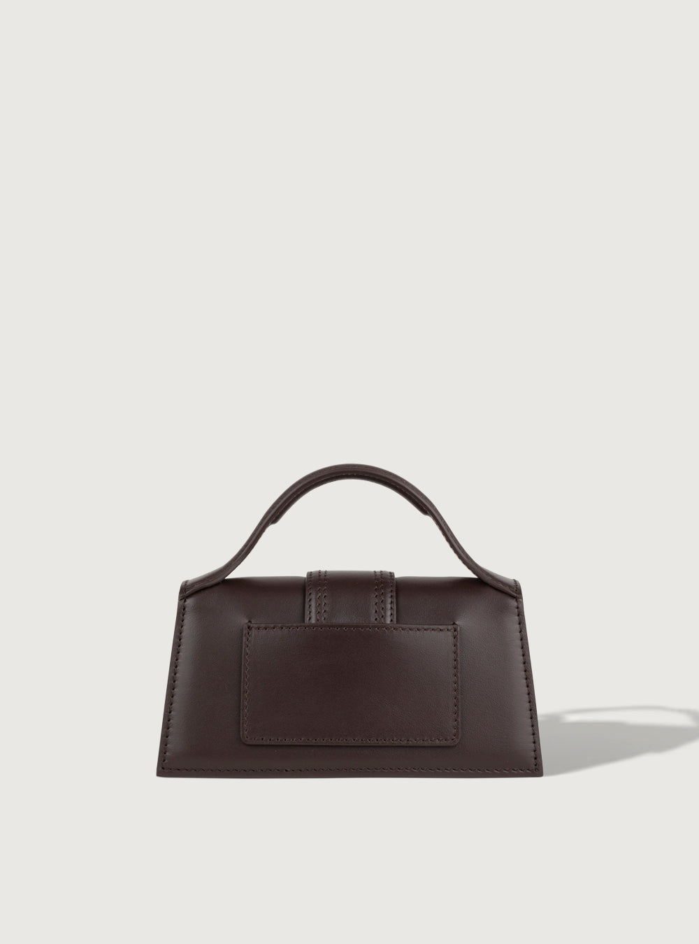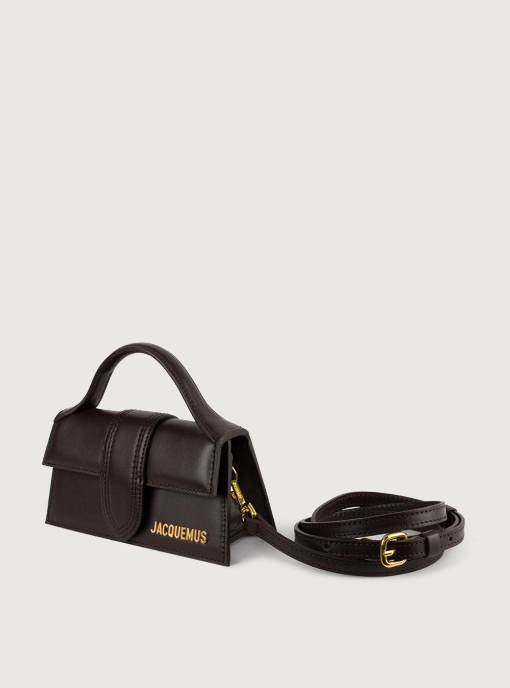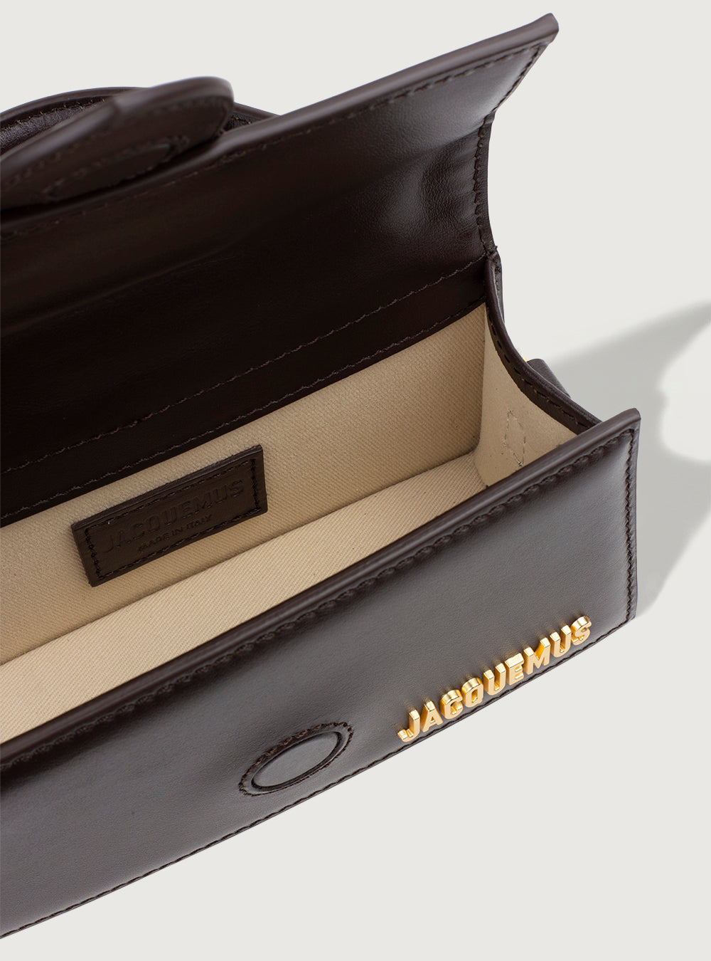 Le Bambino in pelle di vitello marrone con logo dorato in rilievo. Battente con chiusura magnetica, manico rigido ad arco e tracolla rimovibile. Interno con tasca a soffietto.