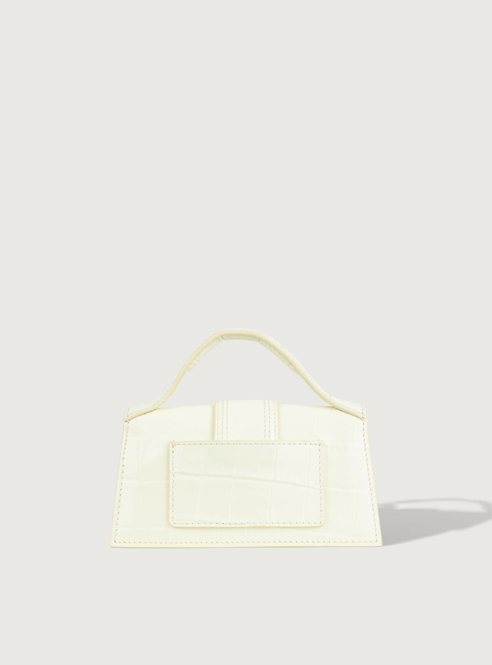 Le Bambino in pelle bianco avorio, motivo coccodrillo con logo dorato in rilievo. Battente con chiusura magnetica, manico piatto e tracolla rimovibile. Interno con tasca a soffietto.