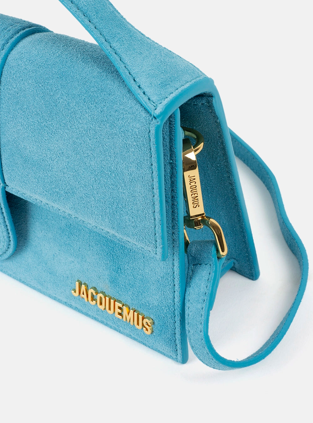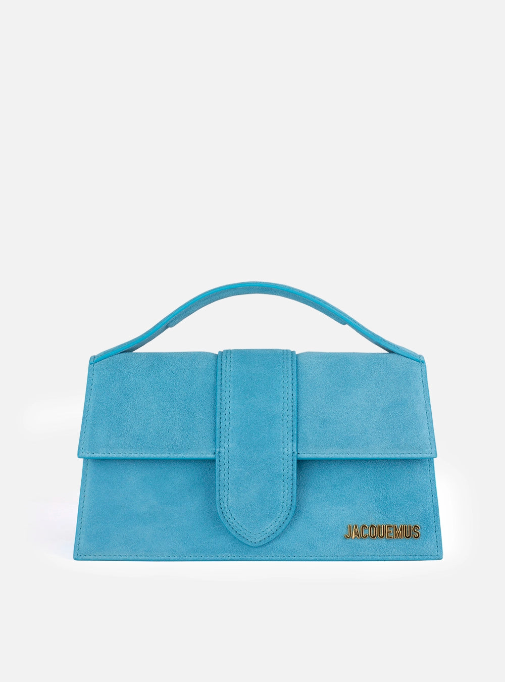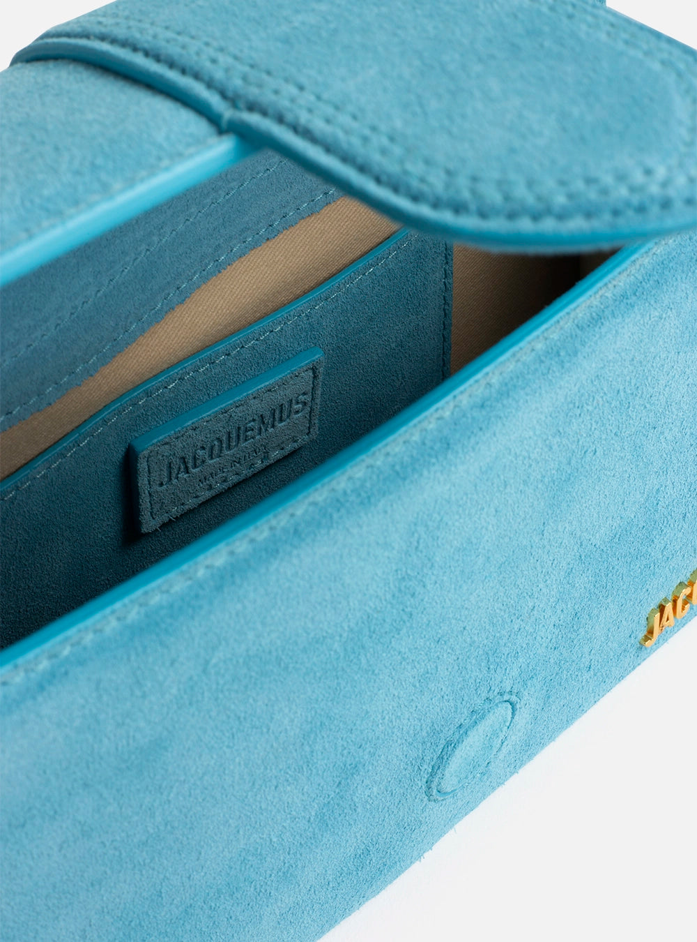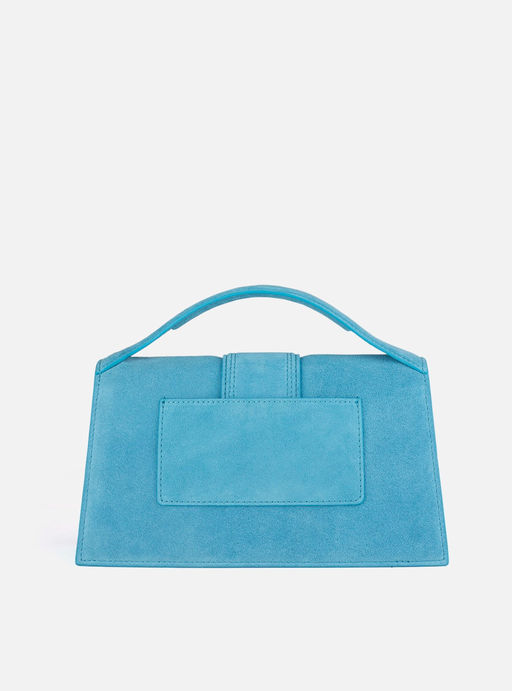 Le Grand Bambino in pelle di vitello azzurra con logo dorato in rilievo. Battente con chiusura magnetica, manico piatto e tracolla rimovibile. Interno con tasca a soffietto.