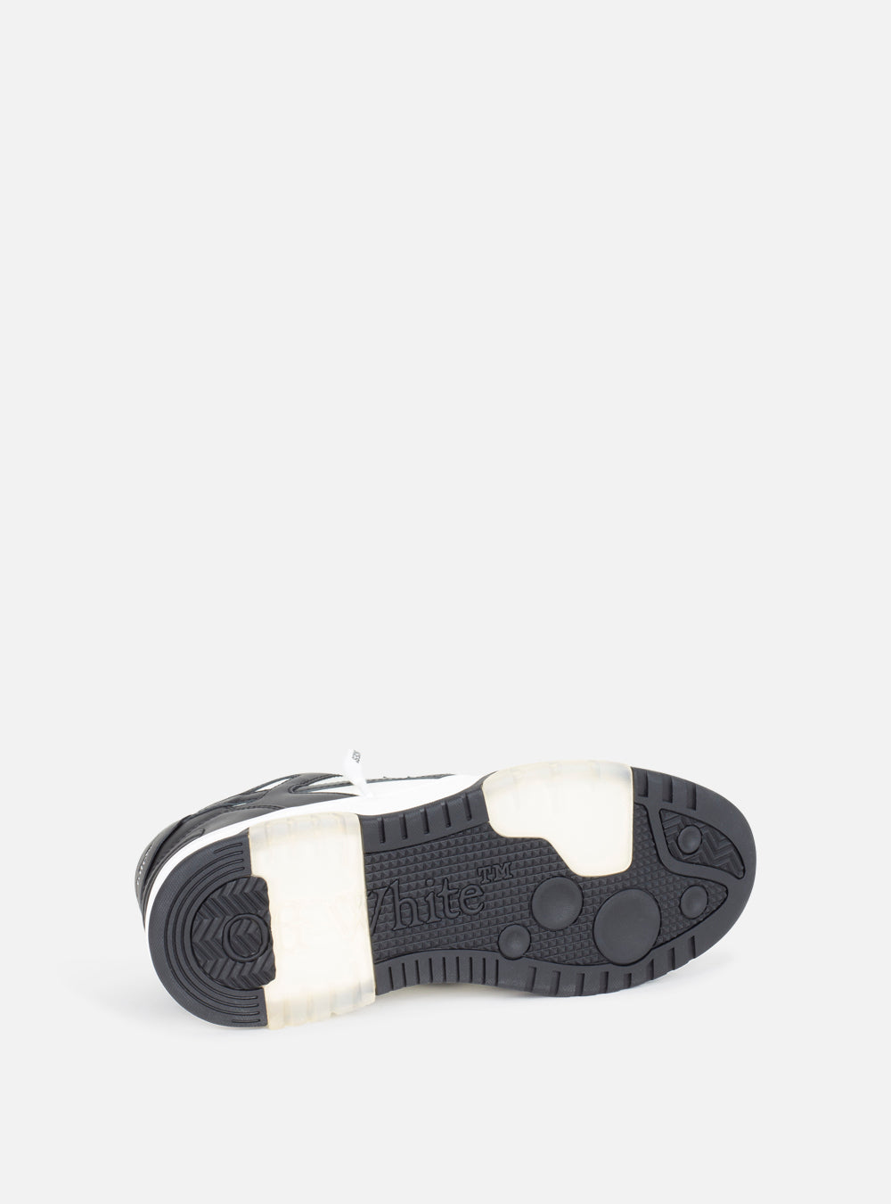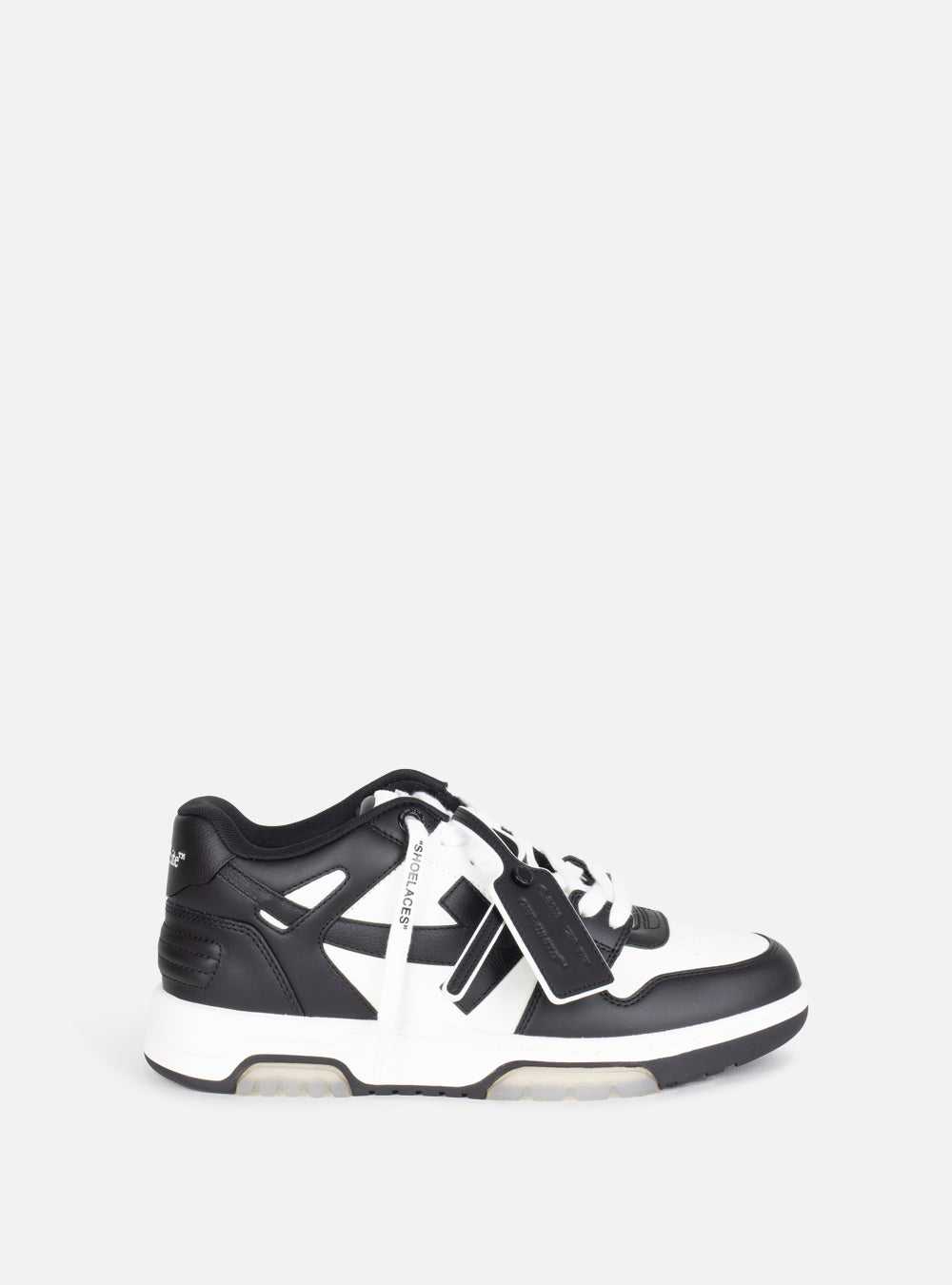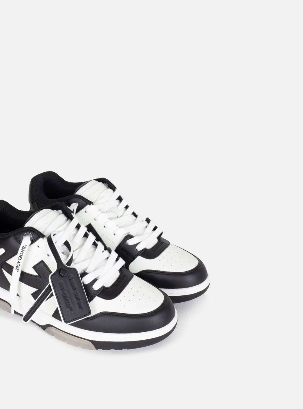 Sneakers Out of office in pelle nera e bianca, targhetta Zip Tie, lacci con stampa “SHOELACES” e punta traforata. Logo su linguetta e tallone, suola in gomma.