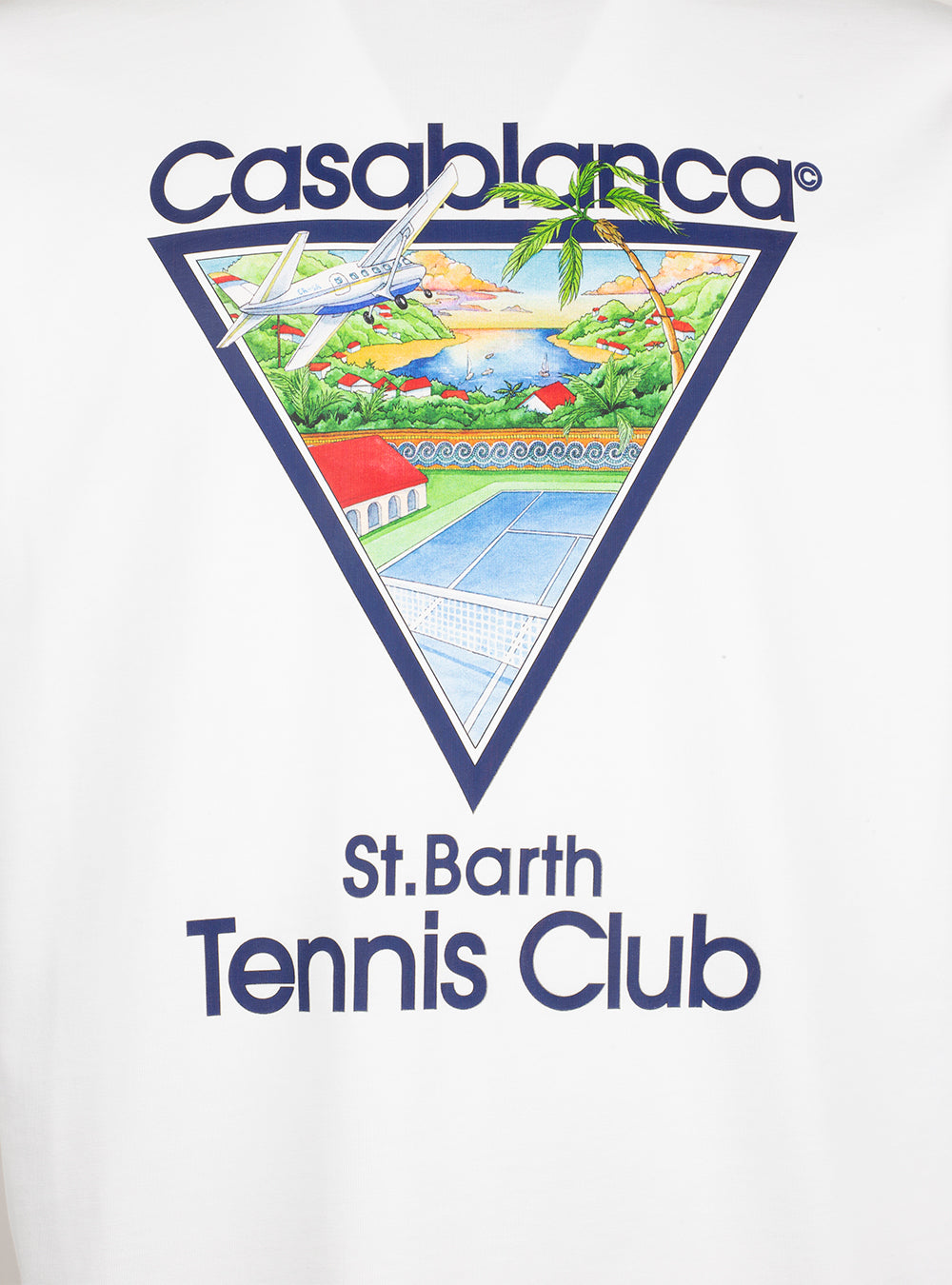 T-shirt in cotone organico con stampa “Tennis Club” dal sapore vintage, raffigurante una scena grafica ispirata all'estetica sportiva e architettonica. Girocollo classico, maniche corte.