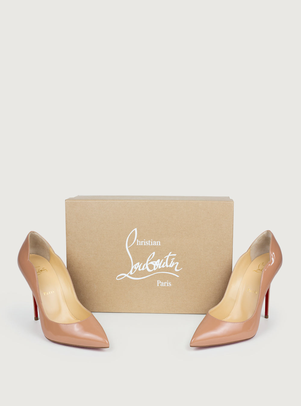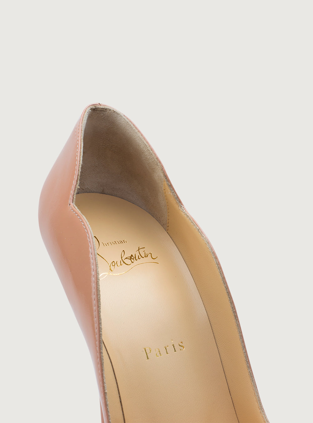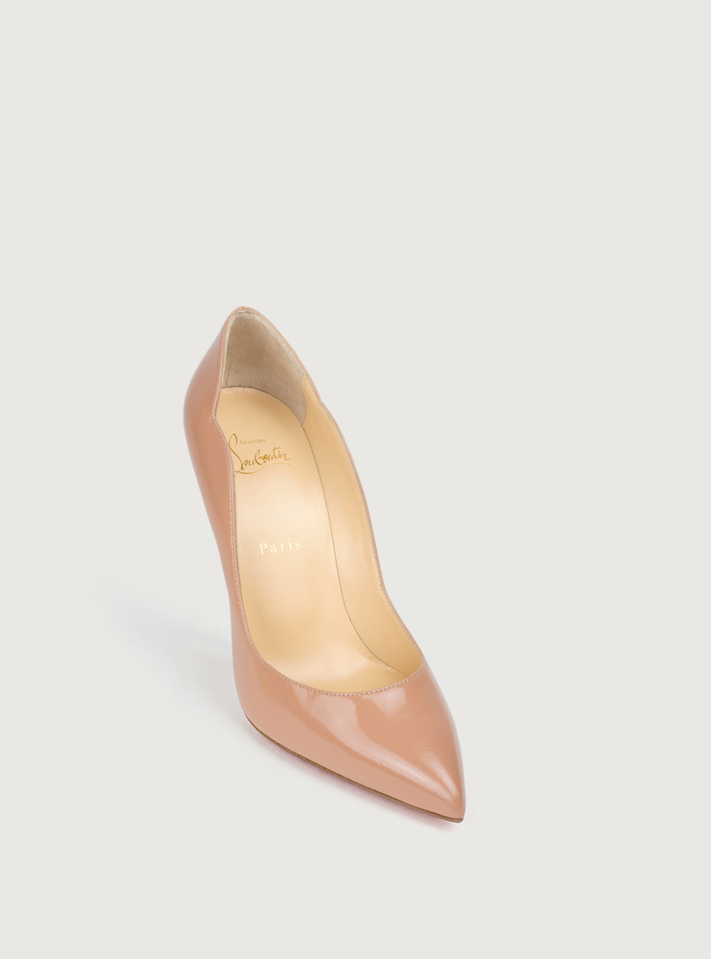 Tacco Hot Chick 10 cm in pelle di vitello verniciata rosa carne con bordi smerlati cuciti a mano, un arco pronunciato e scollatura profonda. Presente naturalmente l'iconica suola rossa che caratterizza il brand.